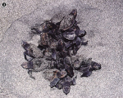 砂の中で卵を破った子ガメたちは、頭上の砂をかき落とし這い出してきます。