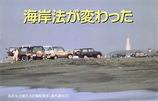 当団体では遠州灘海岸における環境問題に様々な活動を通して取り組んでいます。中でも四輪駆動車対策には大きな力を注いできました。近年、オフロード車の走行による自然破壊は著しく、海岸への車両の乗り入れを規制するよう1987年以来、各方面に働きかけてきました。【 関連20ページ/22ページ〜】