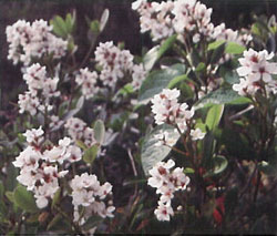 樹高2〜3m程の低木で枝先に2cm程の花をたくさん付けます。長楕円形の厚手の葉が花や実を囲むように並びます。 |