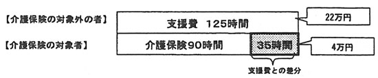 ○介護保険の対象となる場合、介護保険(要介護5)の月90時間相当分と、支援費の国庫補助基準時間である125時間との差分(4万円)を設定