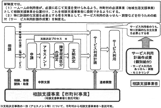 (1)一人一人の利用者が、必要に応じて支援を受けられるよう、市町村の必須事業(地域生活支援事業)として相談支援事業を位置付け、これを相談支援事業者に委託できるようにする。