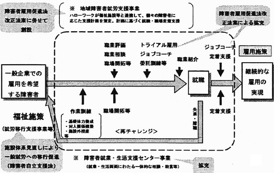 ○職場適応援助者(ジョブコーチ)による援助を行うことに対する助成金の創設、特例子会社に係る調整金・報奨金の支給先の範囲拡大その他所要の改正を行う。