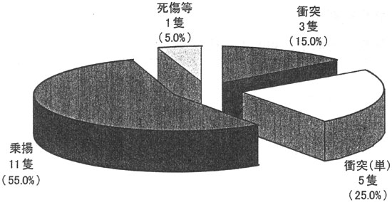 また、事件種類別にみると、乗揚11件、衝突(単)5件、衝突3件、死傷等1件の20件となっている。